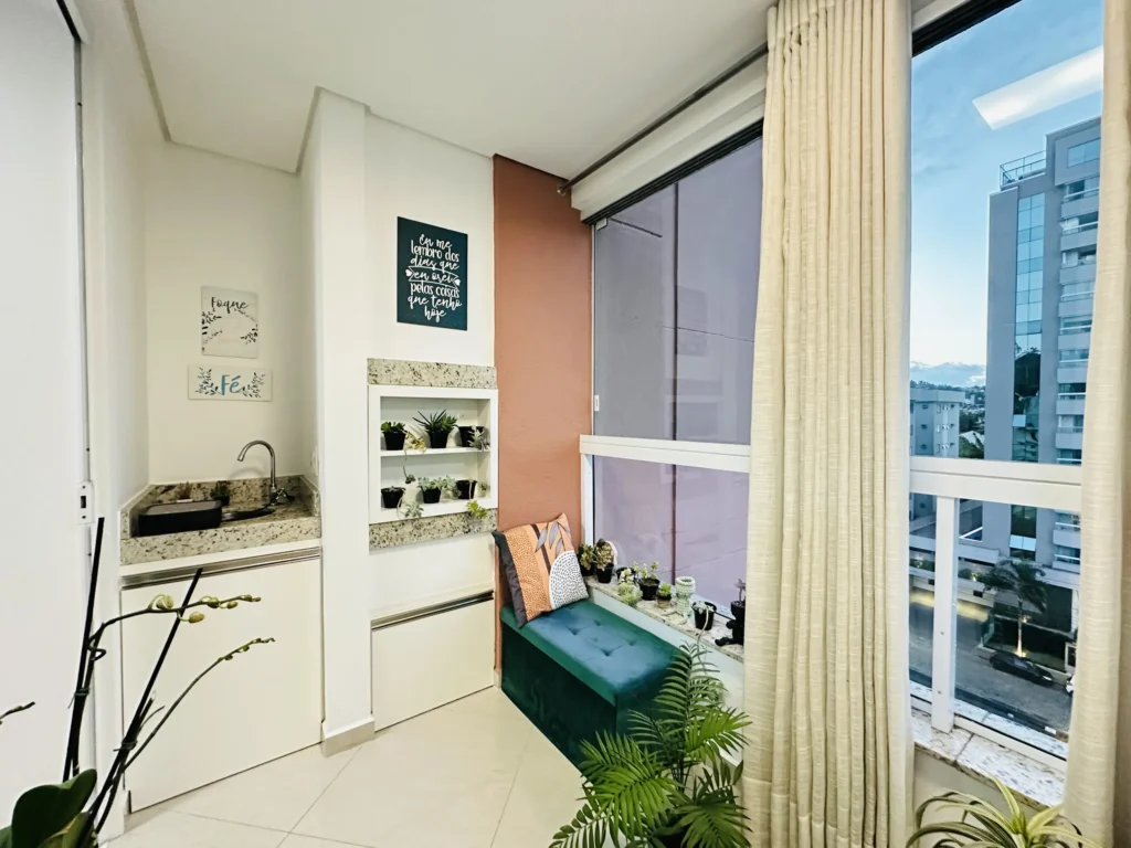 – Sacada integrada, com churrasqueira;