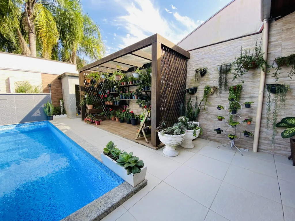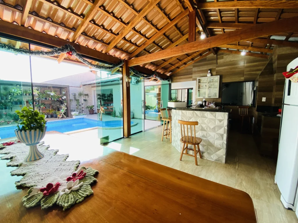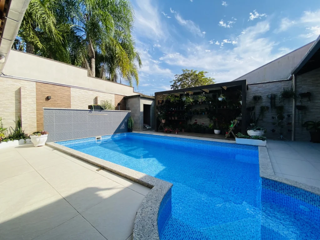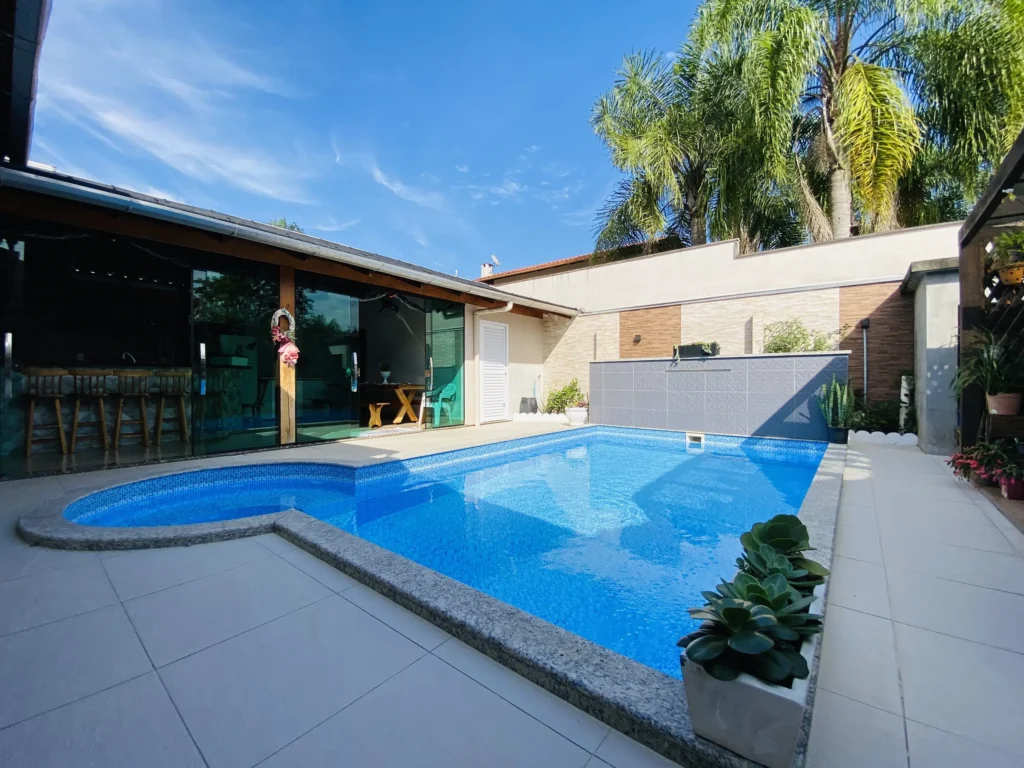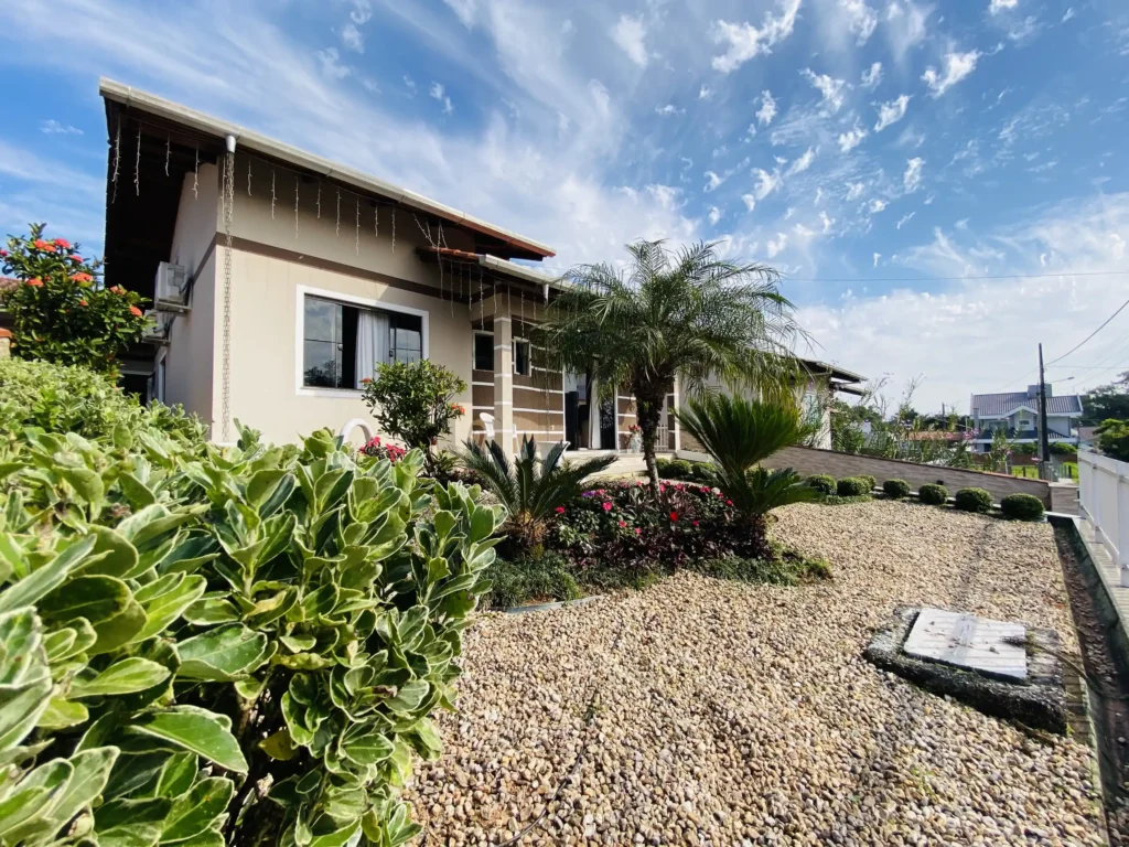 Casa mobiliada em Indaial com 220m², 3 dormitórios (1 suíte), área de festas com churrasqueira e fogão a lenha, piscina aquecida e escritório. Terreno de 425m², em rua sem saída próxima à BR470.