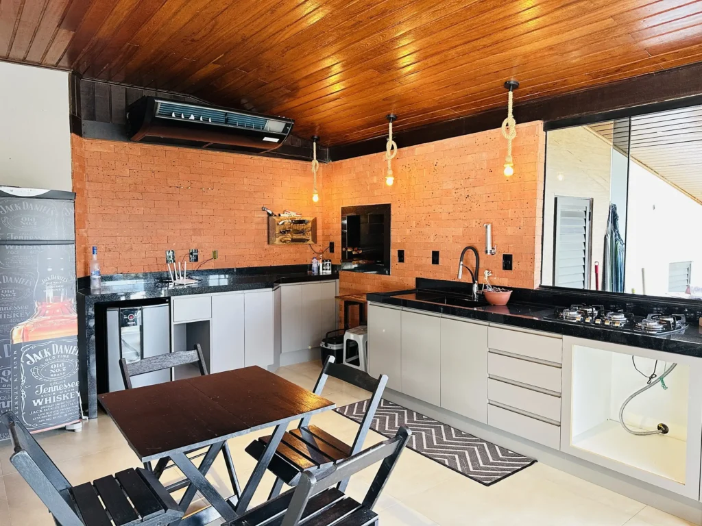 – Área de festas completa, com churrasqueira e fogão a lenha, integrada a um deck com vista encantadora;